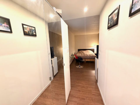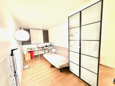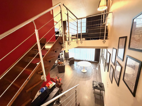 Étage supérieur : un salon mezzanine chaleureux de 23,60 m2 au sol, parfait pour un espace lecture, télétravail ou coin détente. Un placard dissimule un espace de rangement supplémentaire.