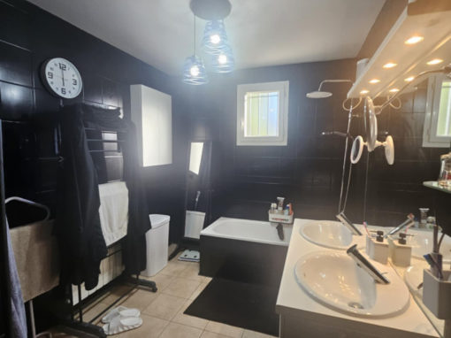 Grande salle de bain de 8,54 m2 avec baignoire, douche et double vasque