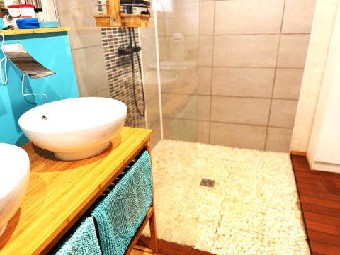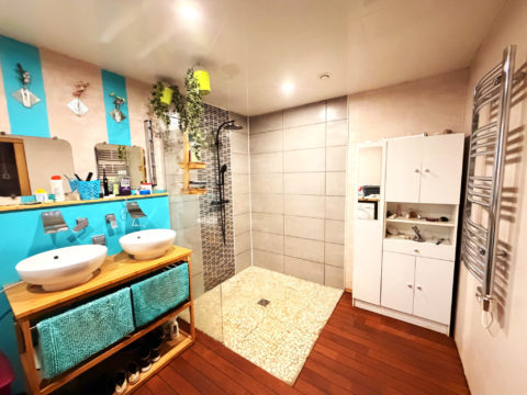 Une salle d’eau spacieuse de 9,38 m2 avec douche à l’italienne