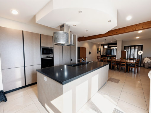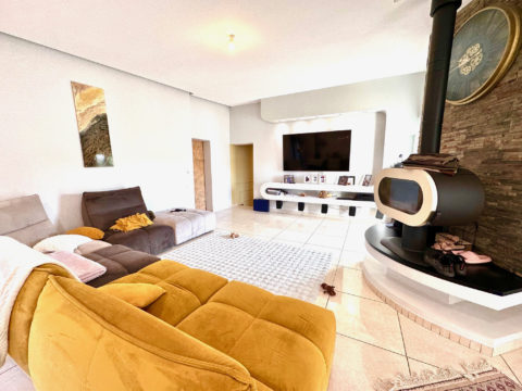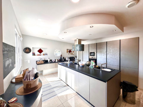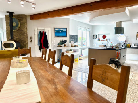 Espace de vie de 70 m2 comprenant une cuisine équipée avec îlot central de 27 m2 ouverte sur un salon-séjour climatisé de 42 m2, avec poêle à bois, idéal pour les soirées d’hiver.
