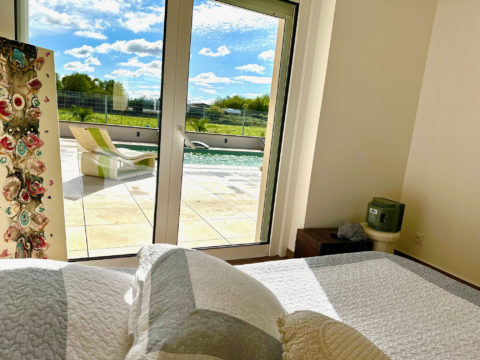 Chambre de 13,58 m2 avec accès direct à la piscine.