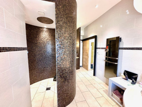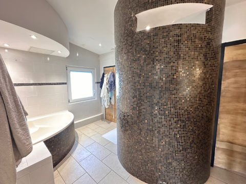 Salle de bain de 13 m2 avec baignoire d’angle, douche arrondie et VMC.