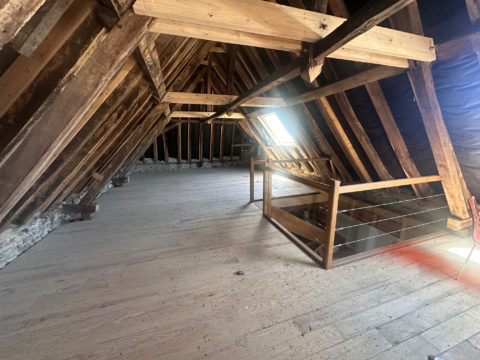 2e étage sous combles : (Superficie Carrez : 45 m2, soit 86 m2 au sol). Présence de 3 Velux. Toiture refaite en 2013 avec pare-pluie, mais pas encore isolée.